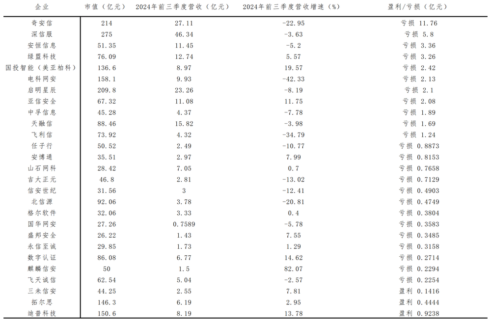 一是行业仍呈现高市值和盈利难的矛盾。27家企业中仅有3家企业盈利,其余24家均处在亏损中。但7家企业市值均在百亿以上,深信服、启明星辰、奇安信等头部厂商市值均在200亿元以上。