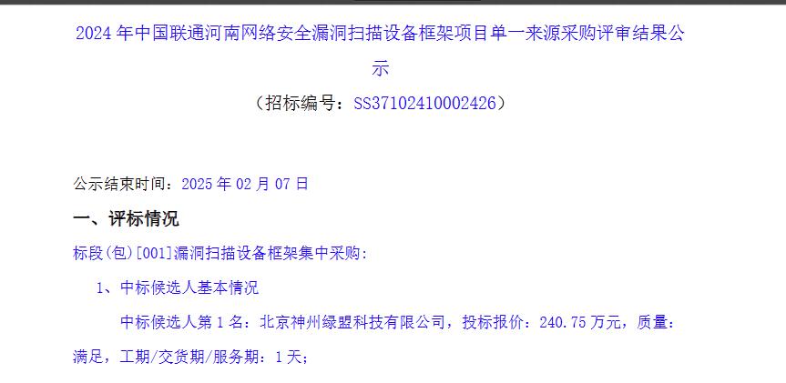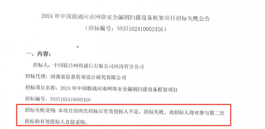 近日,河南联通网络安全漏洞扫描设备框架项目公布中标结果,该项目历经两次招标,最终因有效投标人不足宣布招标失败,如今终于尘埃落定,哪家企业成功中选?