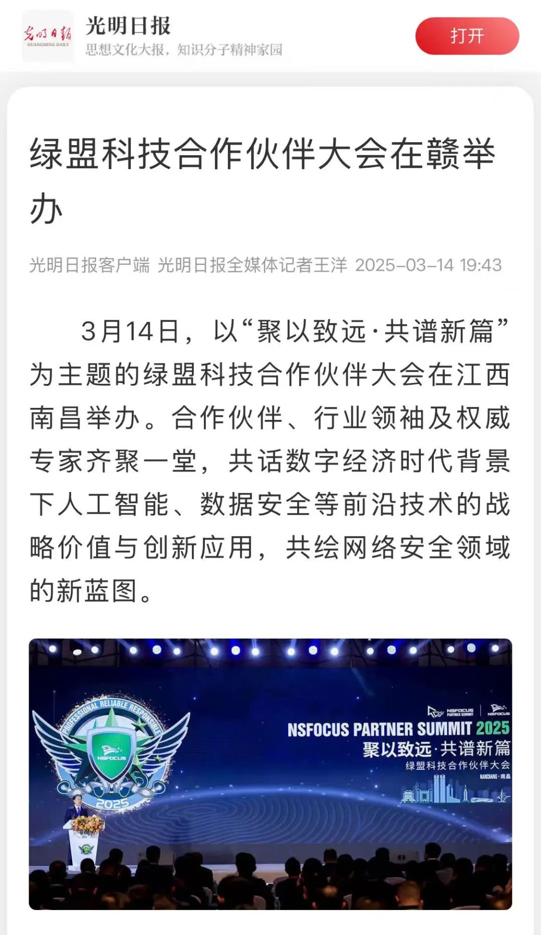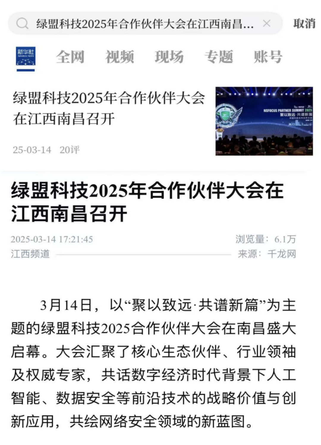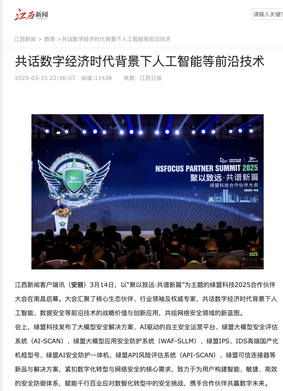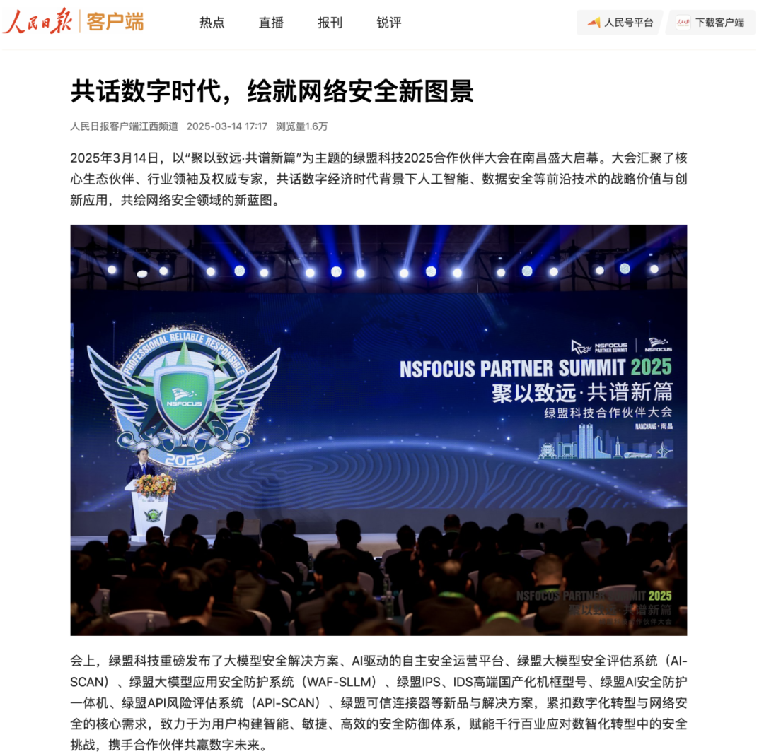 在绿盟科技2025合作伙伴大会上,绿盟科技围绕人工智能安全、数据安全等前沿领域发布多项创新成果,受到人民日报、新华社、光明日报、江西日报等权威媒体的广泛关注,并通过报纸、客户端、网站、视频等多渠道传播,充分展现了绿盟科技在行业中的技术创新与实践成果。