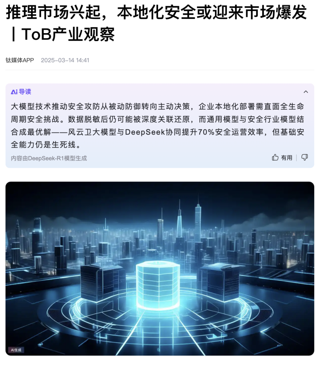 绿盟科技持续加大在安全研究和技术创新的投入,尤其在人工智能安全领域投入多年,有着丰硕的成果和应用,已成功完成对DeepSeek-R1的接入,实现风云卫AI安全能力平台实现自研安全大模型与DeepSeek双基座协同,优势互补。