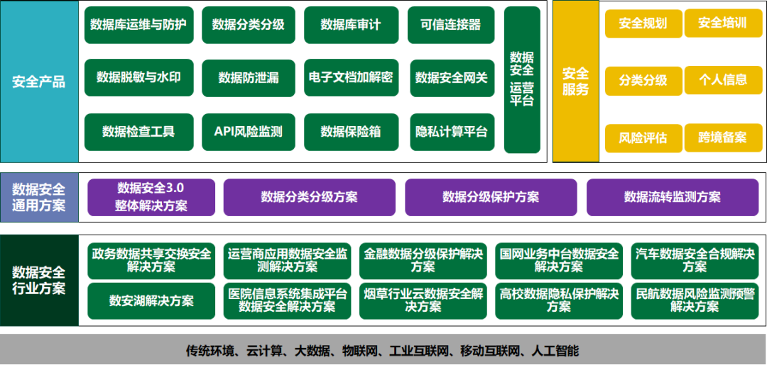 多年来,绿盟科技注重传统安全与数据安全结合,在数据安全领域,不断沉淀成熟的产品、服务和方案,秉承数据安全“有效保护、合法利用、持续安全”的目标,积累各行业不同场景、不同业务、不同数据对于数据安全的个性化需求。持续改进数据安全解决方案,从“产品级解决方案、业务级解决方案、生态级解决方案、战略级解决方案”的不同维度,形成了解决方案库。创新性地以“纵向行业,横向场景”的方法,先后形成了金融、政务、电力、交通、工业等多行业的数据安全解决方案二十余个,通过多年的实践和持续改进,赢得了客户的一致好评。