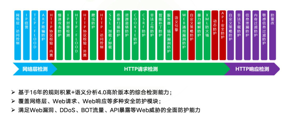 绿盟WAF整合传统WAF能力、BOT防护、API安全及DDoS缓解等能力,构建一体化防护体系。通过六位一体检测引擎(规则、语义分析、威胁情报、自学习、智能补丁),精准识别OWASP TOP 10攻击及0day漏洞。针对API滥用、BOT自动化攻击(如撞库、爬虫),其智能流量分析引擎可动态阻断恶意行为,减少业务欺诈损失。