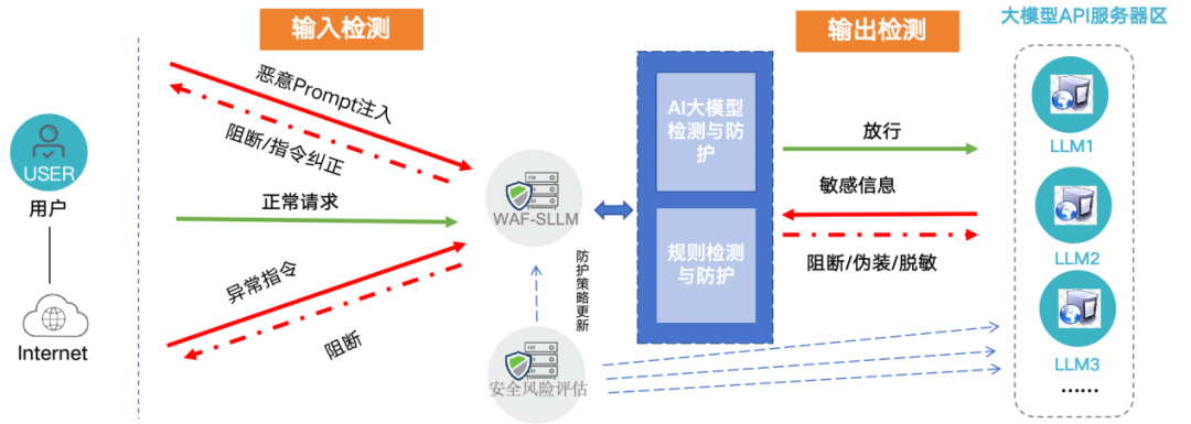 绿盟WAF集成大模型防护能力,在系统自身安全层面,依托规则库,为大模型应用系统提供开源组件漏洞检测和防御能力,可有效防护攻击者利用WEB相关漏洞对大模型发起攻击,在内容安全方面,通过AI大模型算法引擎与安全语料库的深度结合,实时检测并拦截HTTP请求中植入的恶意提示词攻击,实现大模型应用的内容安全主动防御;在API防护方面,可自动发现API资产、识别异常访问行为。