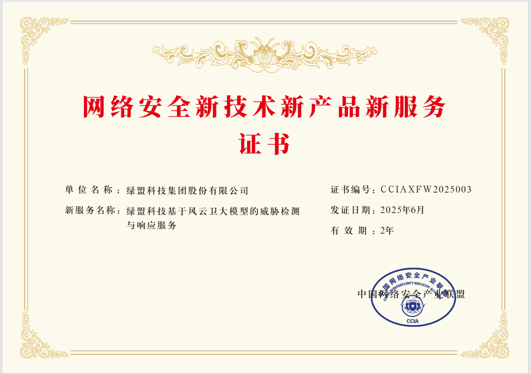 近日,中国网络安全产业联盟(CCIA)发布“网络安全新技术新产品新服务(第一批)”遴选结果。绿盟科技风云卫AI安全能力平台入选新产品名单,基于风云卫大模型的威胁检测与响应服务入选新服务名单。