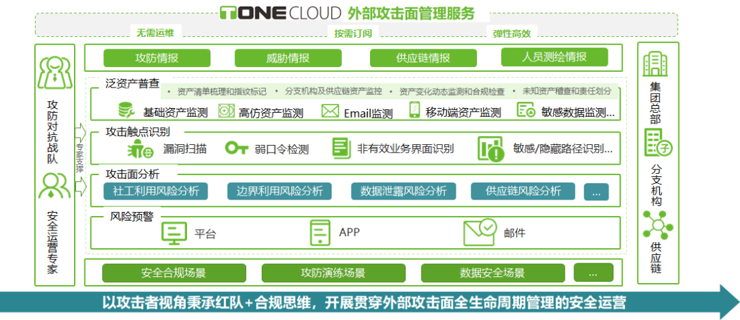 外部攻击面管理服务是一款集泛资产普查、攻击触点识别、攻击面分析、风险预警为一体的SaaS服务。服务以攻击者视角监控本级单位、分支机构、供应链暴露在互联网侧的泛资产,并通过大模型自动验证外部攻击触点。同时,系统自动结合AI知识图谱,主动映射攻击面,分析并预测易被网络犯罪分子利用的安全风险,并及时进行风险预警,辅助组织完成风险处置闭环。