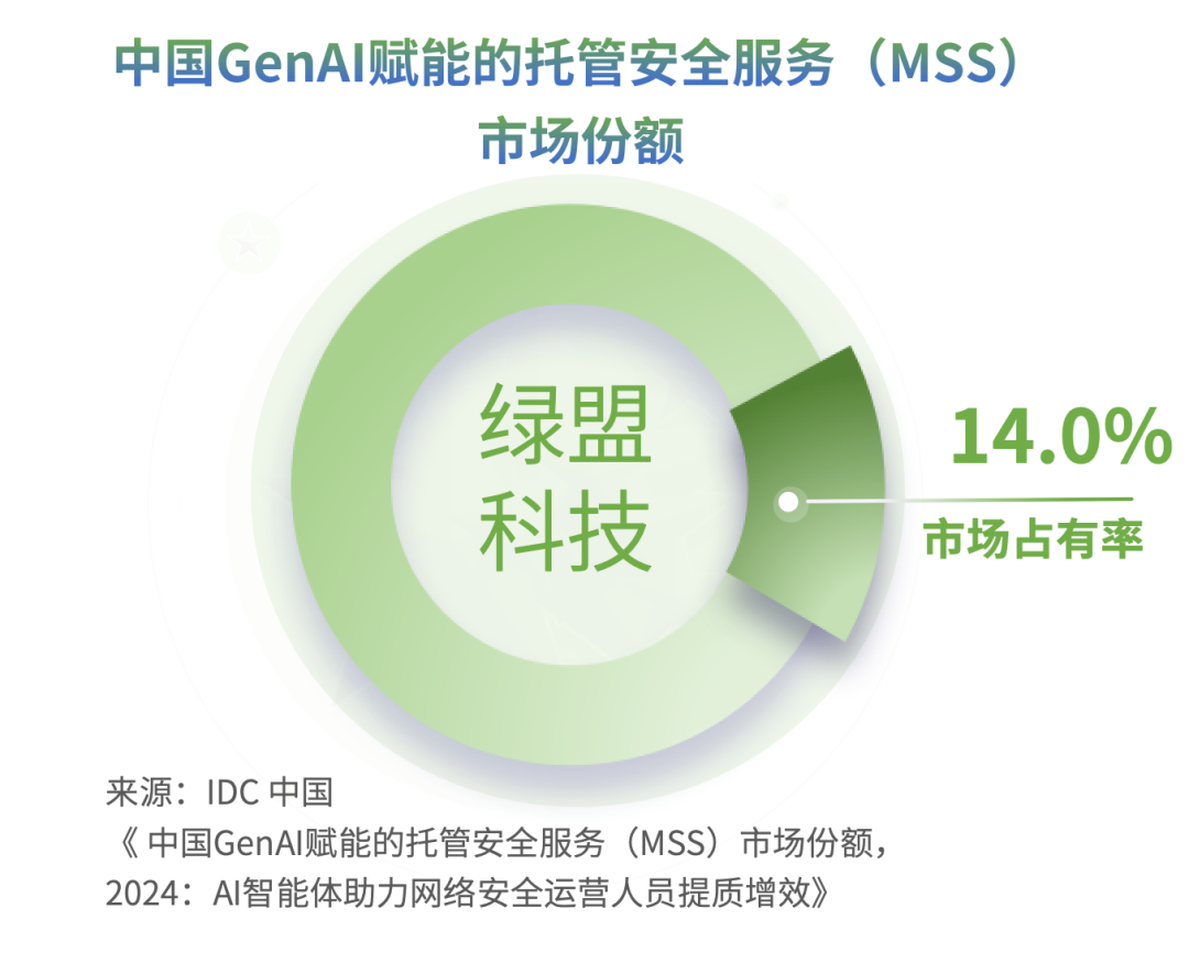 近日,国际权威咨询机构IDC发布最新市场报告《中国GenAI赋能的托管安全服务(MSS)市场份额,2024:AI智能体助力网络安全运营人员提质增效》(Doc # CHC53602725 ,2025年6月)(以下简称《报告》),绿盟科技托管安全服务以14.0%的市场份额名列国内厂商第二名。