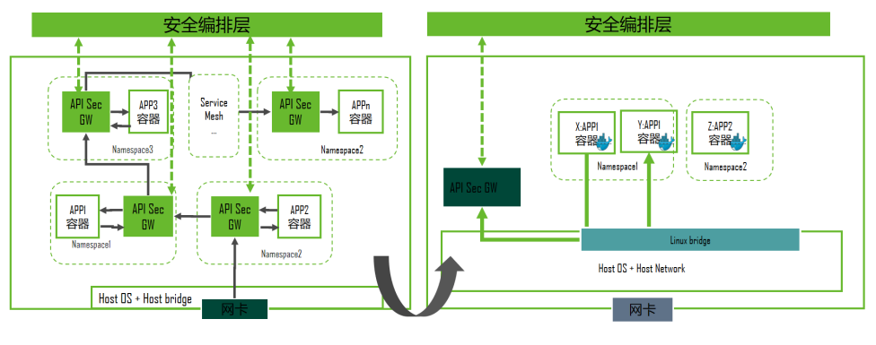图左为适配于Service Mesh的微API安全网关方案,安全能力采用轻量级的方式,无感知地接入每个微服务应用中,根据集群具体业务不同,可采用不同的API安全模块进行精准防护。此方案与Service Mesh配合使用,能够快速将微API安全网关注入至每个微服务应用中,同时对集群中的每个微API安全网关运行数据进行管理面上统一分析,并通过安全编排层进行服务策略编排,实现基于微服务粒度的全向安全防护能力,图右为适配于Kubernetes的节点API安全网关方案,该方案采用eBPF技术将集群微服务引流从用户空间offload至内核层实现,降低系统CPU消耗的同时,提升了处理性能,也同时支持全向流量安全防护及灵活的策略编排。