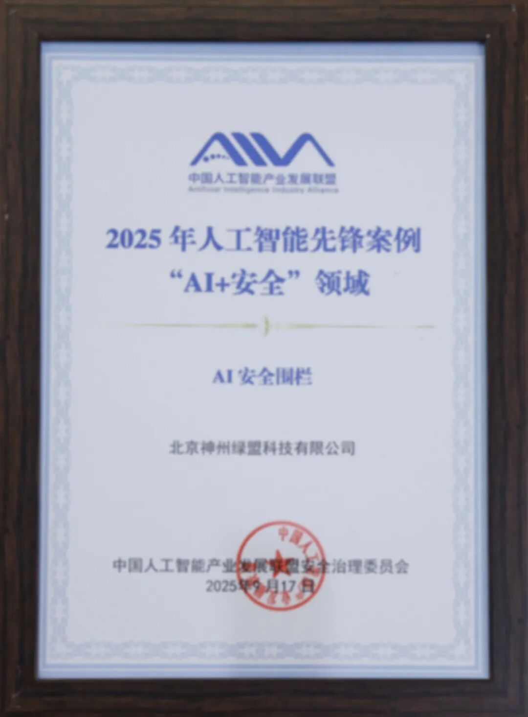 2025年9月17日,中国人工智能产业发展联盟(AIIA)安全治理委员会发布“AI+安全”专项先锋案例征集结果,绿盟科技“AI安全围栏”案例,成功入选《2025年人工智能先锋案例|“AI+安全”领域》。