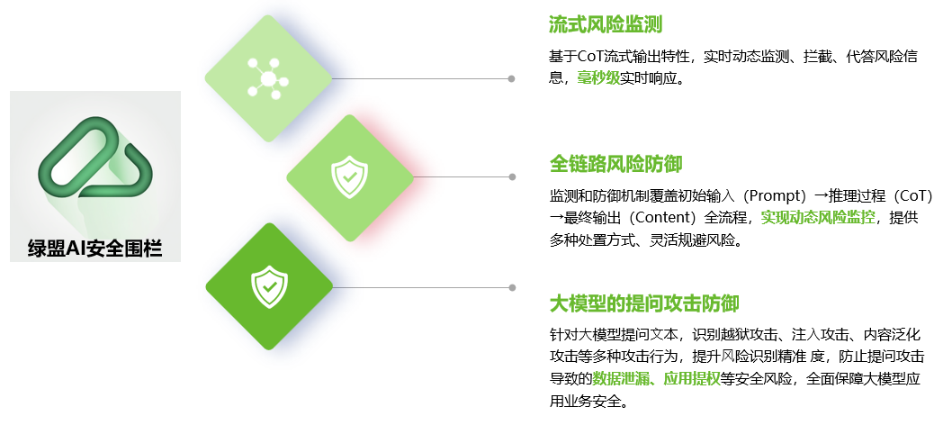 绿盟AI安全围栏深度融合多维度AI安全检测模型,通过语义理解、意图识别和流式风险分析等先进技术,构建覆盖"输入-推理-输出"全链路的智能防护体系。产品基于四大核心防护能力,为大模型应用提供精准可控的安全保障: