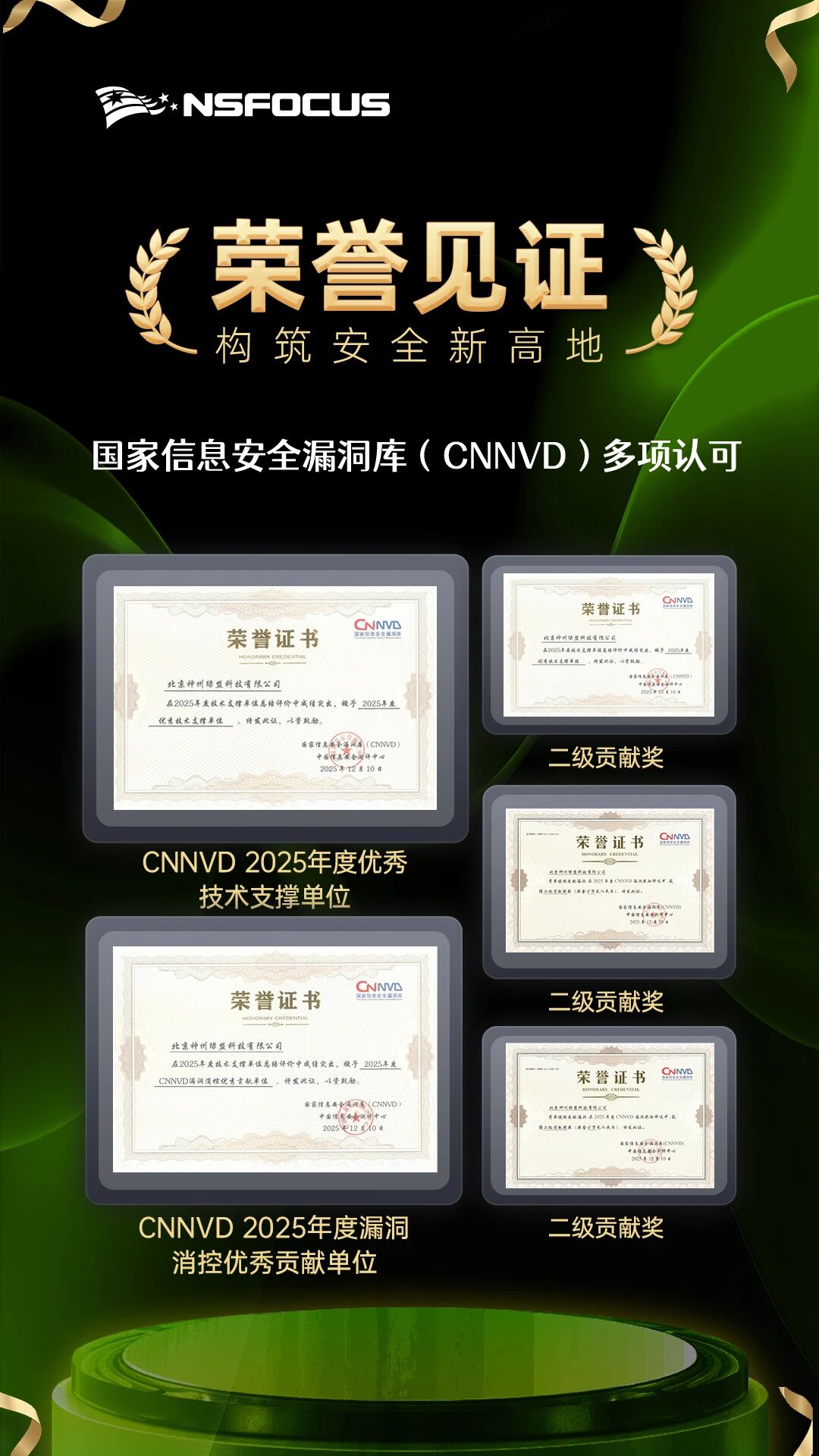 绿盟科技 此次获得CNNVD颁发的五项重要荣誉,充分彰显了其在漏洞挖掘、分析、报送等方面的突出表现。自2013年首批入选CNNVD技术支撑单位(一级)以来, 绿盟科技 已经连续12年服务于CNNVD,积极完成原创漏洞报送、漏洞信息报送、预警信息共享、研究报告共享和应急响应支撑等任务,获得了CNNVD的高度认可和赞誉。