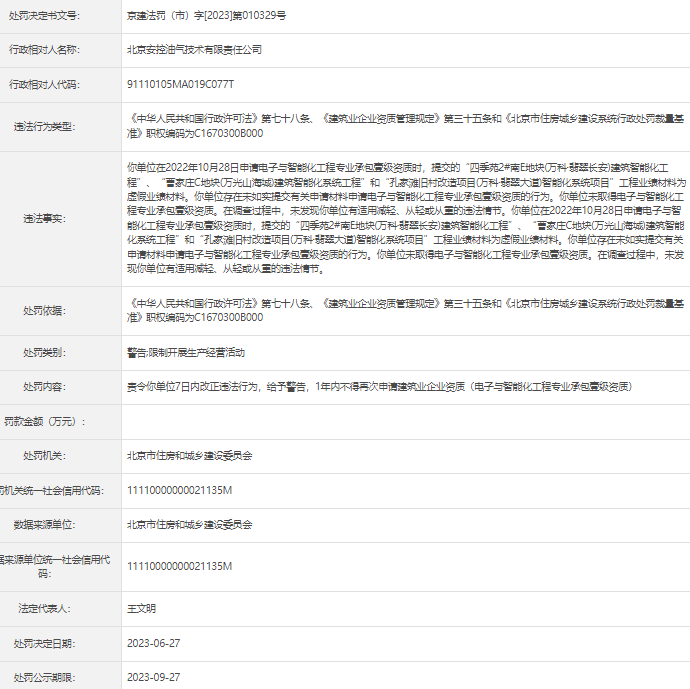 北京市住房和城乡建设委员会指出,安控油气存在未如实提交有关申请材料申请电子与智能化工程专业承包壹级资质的行为,其未取得电子与智能化工程专业承包壹级资质。