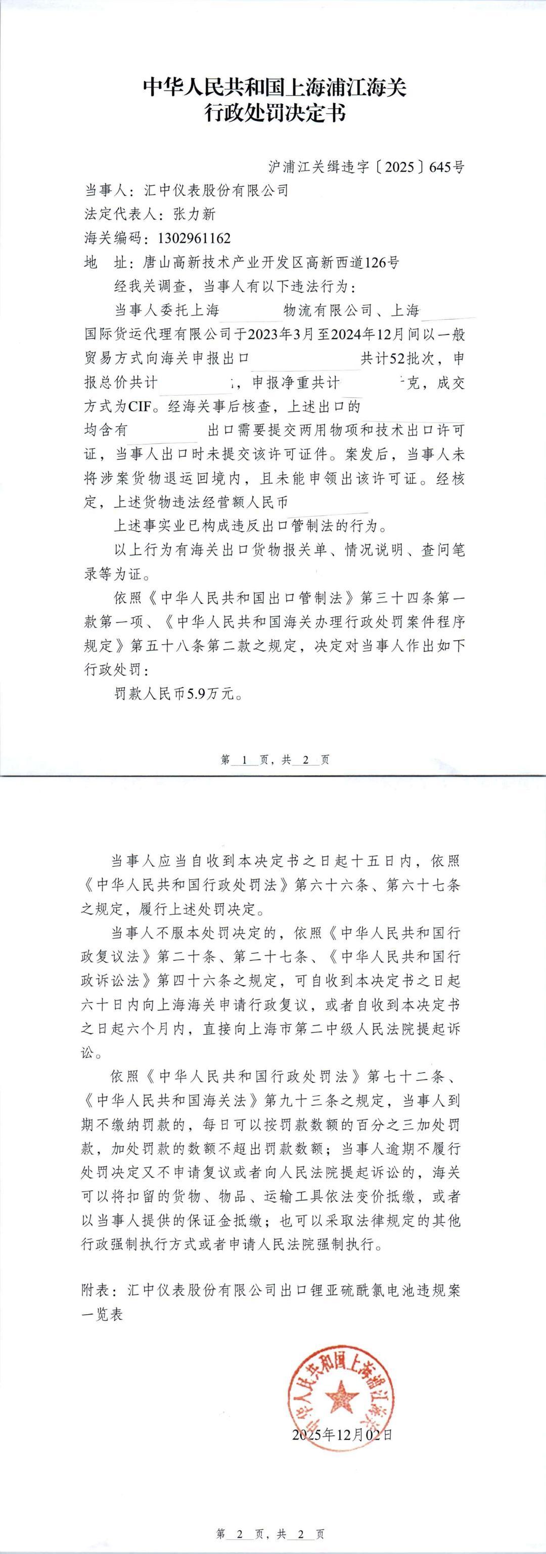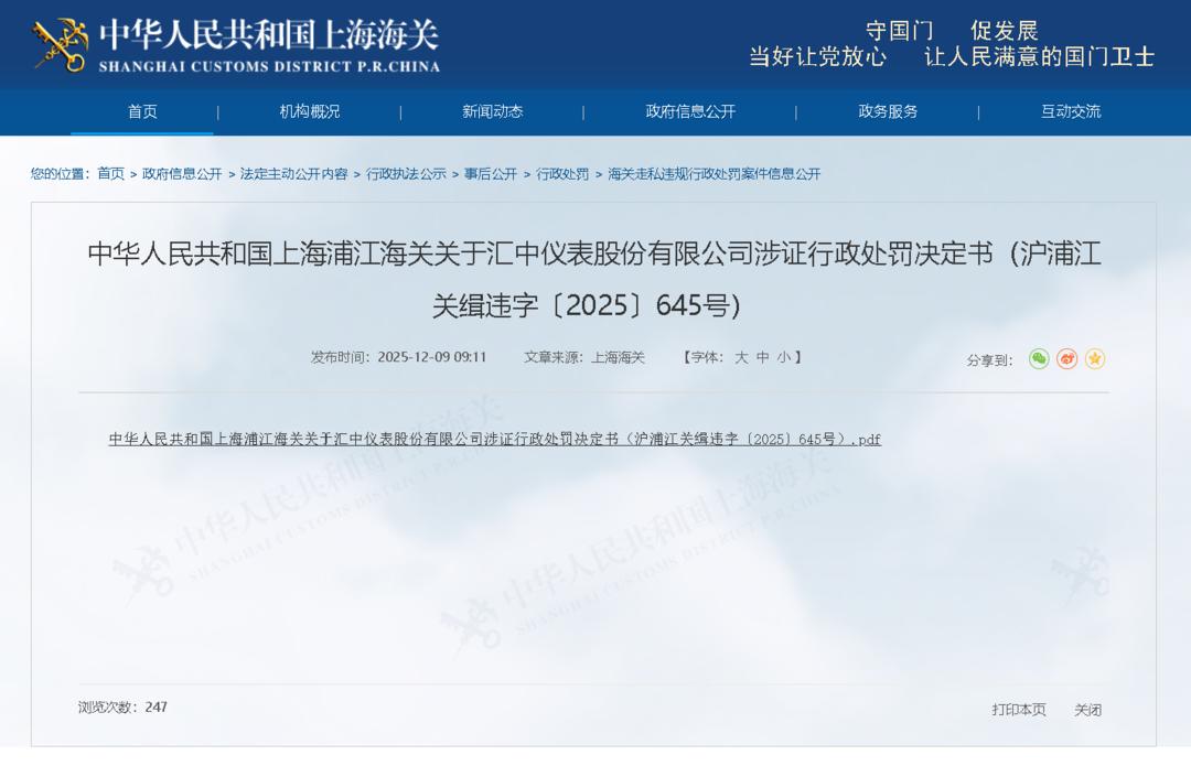 近日, 中华人民共和国上海浦江海关 发布关于汇中仪表股份有限公司( 汇中股份 300371)涉证行政处罚决定书(沪浦江关缉违字〔2025〕645号)。