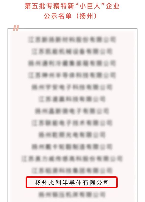 近日,江苏省工信厅和四川省经信厅分别发布了《关于江苏省第五批专精特新“小巨人”企业和第二批专精特新“小巨人”复核通过企业名单的公示》、《关于四川省第五批专精特新“小巨人”企业和第二批专精特新“小巨人”复核通过企业名单的公示》,扬杰科技子公司杰利半导体、成都青洋电子榜上有名!