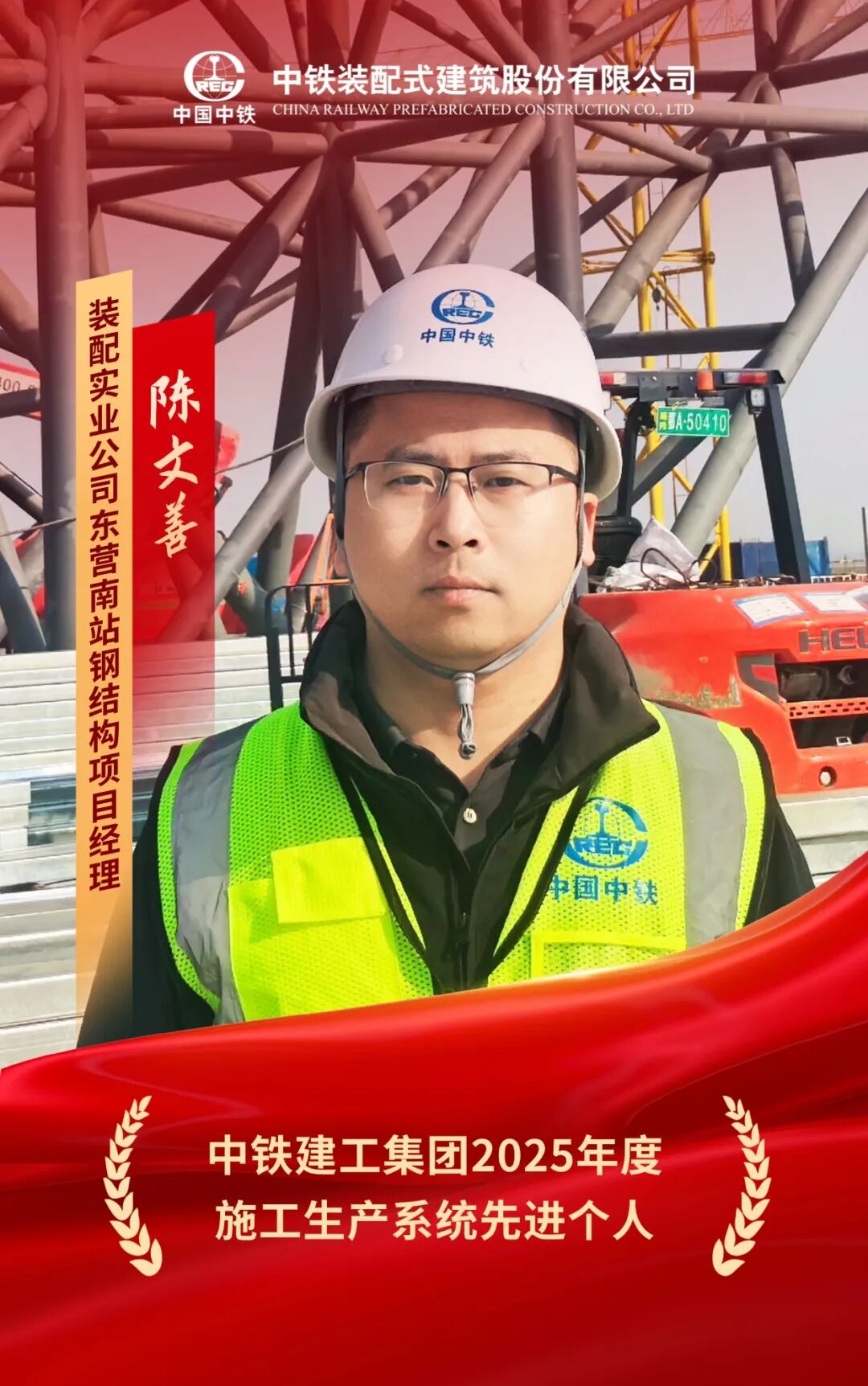 项目开工以来,陈文善同志带领项目团队攻坚克难,优化施工组织,创新采用国内首创“表皮一体式滑移”施工方案,攻破既有线施工、变形与沉降等各类技术难题,顺利完成重达1400吨整体屋盖精准滑移,实现整体进度提前15天。全过程严抓安全质量,项目实现安全生产“零事故”。2025年负责的项目累计安装14000吨,完成产值约1.3亿元,并足额缴纳指标款,为公司整体产值和现金流做出重要贡献。曾荣获中铁建工集团“优秀共产党员”“十大项目管理标兵”,中铁装配“优秀共产党员”“五保一树”劳动竞赛先进个人等荣誉,用实干实绩为公司高质量发展注入了强劲动能。
