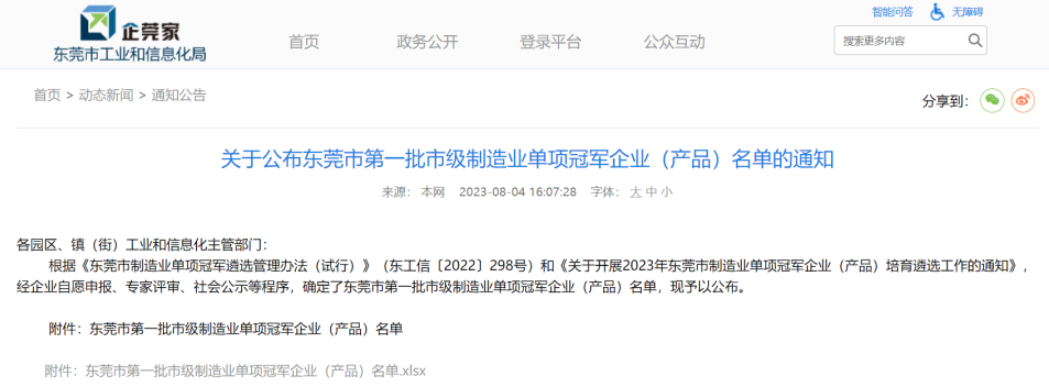 近期,东莞市工业和信息化局组织开展培育遴选工作,并正式公布了东莞市第一批制造业单项冠军企业(产品)名单。