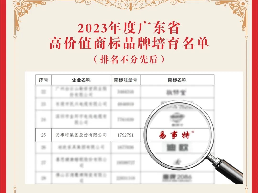 8月18日,广东省商标协会发文公布《2023年度广东高价值商标品牌培育名单》。易事特集团继荣获“国家知识产权示范企业”“中国驰名商标”“广东省重点商标保护名录”等荣誉称号后,企业商标与“喜之郎、箭牌”等行业头部品牌商标成功入选此次名单,创新实力、综合竞争力和发展前景等再获肯定。