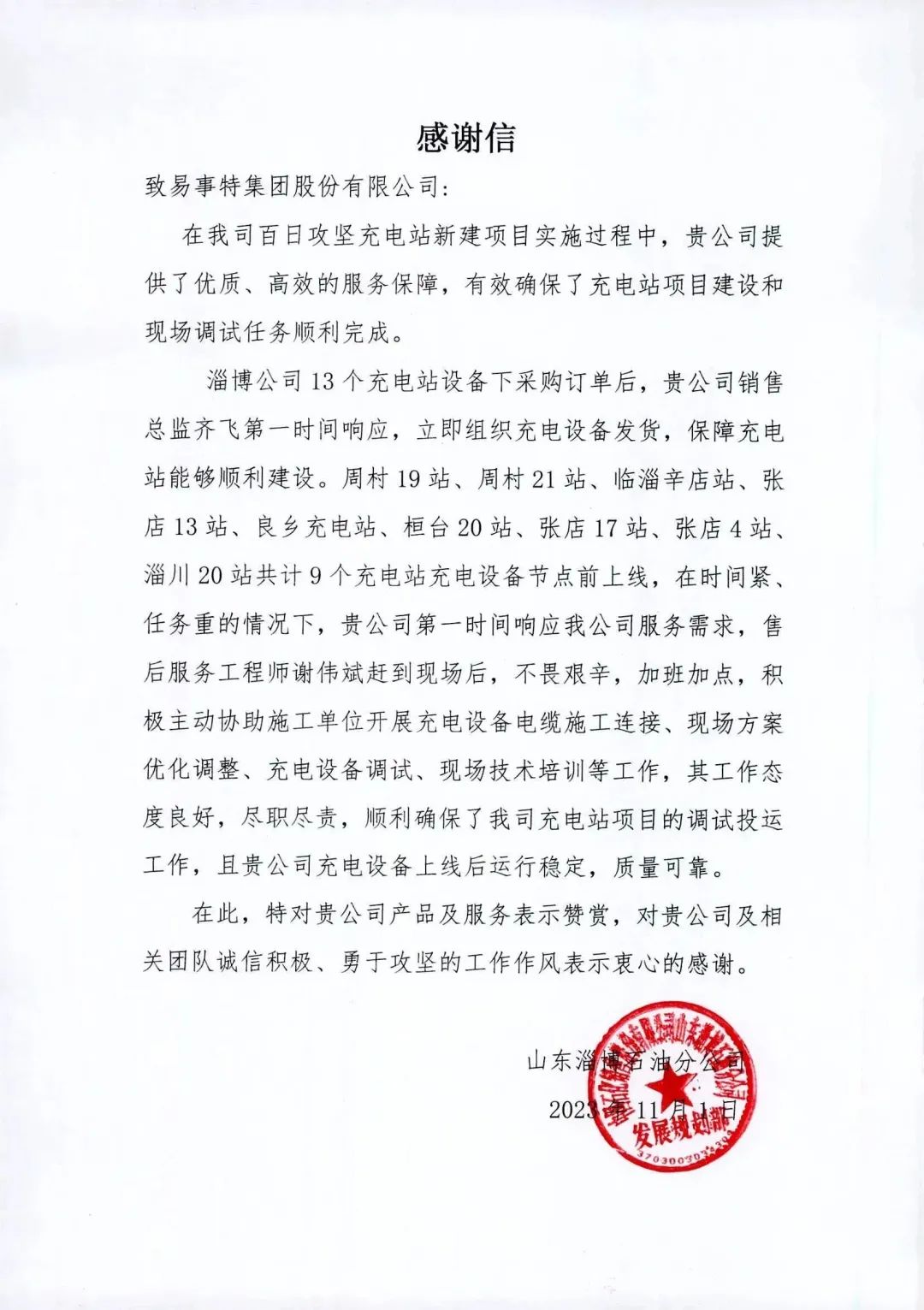 易事特集团继助力中石化广东广州石油分公司首座自营充电站投用后,又成功服务中石化系统多个省市公司。中石化山东淄博分公司百日攻坚充电站项目建设和调试近期顺利完成,并特地给易事特集团发来感谢信。