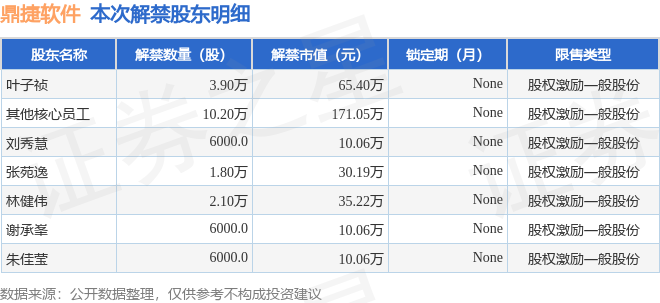 根据市场公开信息整理,鼎捷软件(300378)于4月29日将有19.8万股限售股份解禁上市,为公司股权激励一般股份,占公司总股本0.07%。最近一年内,该股累计解禁221.42万股,占总股本的0.82%。本次解禁后,公司还有172.2万股限售股份,占总股本0.64%。具体如下图所示: