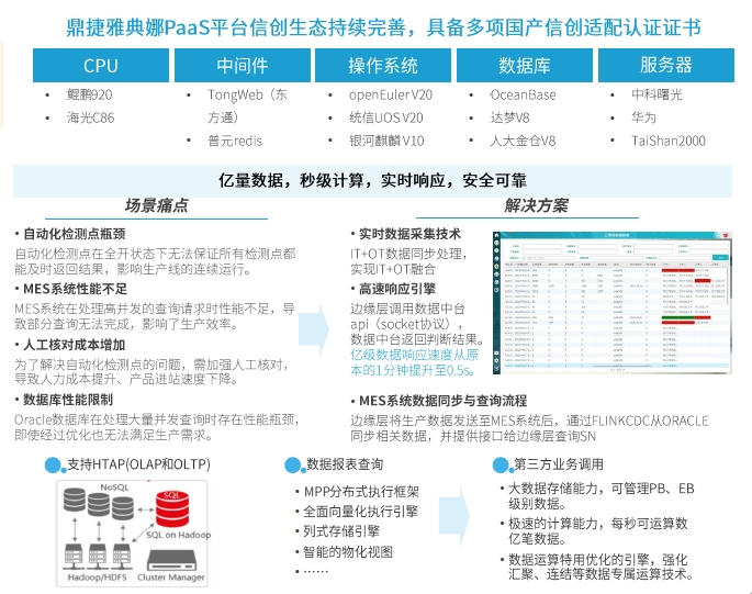 目前,鼎捷雅典娜、T100、PLM等产品已全面支持信创环境,能够满足客户在国产化替代过程中的多样化需求。同时,聚焦国产化硬件、操作系统、数据库、中间件等,进行了全面的适配工作,成功完成与众多主流信创产品的兼容性认证。