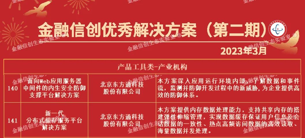 近日,中国人民银行旗下金融信创生态实验室在京举办金融信创解决方案研讨会,正式发布第二期金融信创优秀解决方案,东方通的面向Web应用服务器中间件的内生安全防御支撑平台、新一代分布式缓存服务平台两项解决方案实力入选该荣誉奖项。