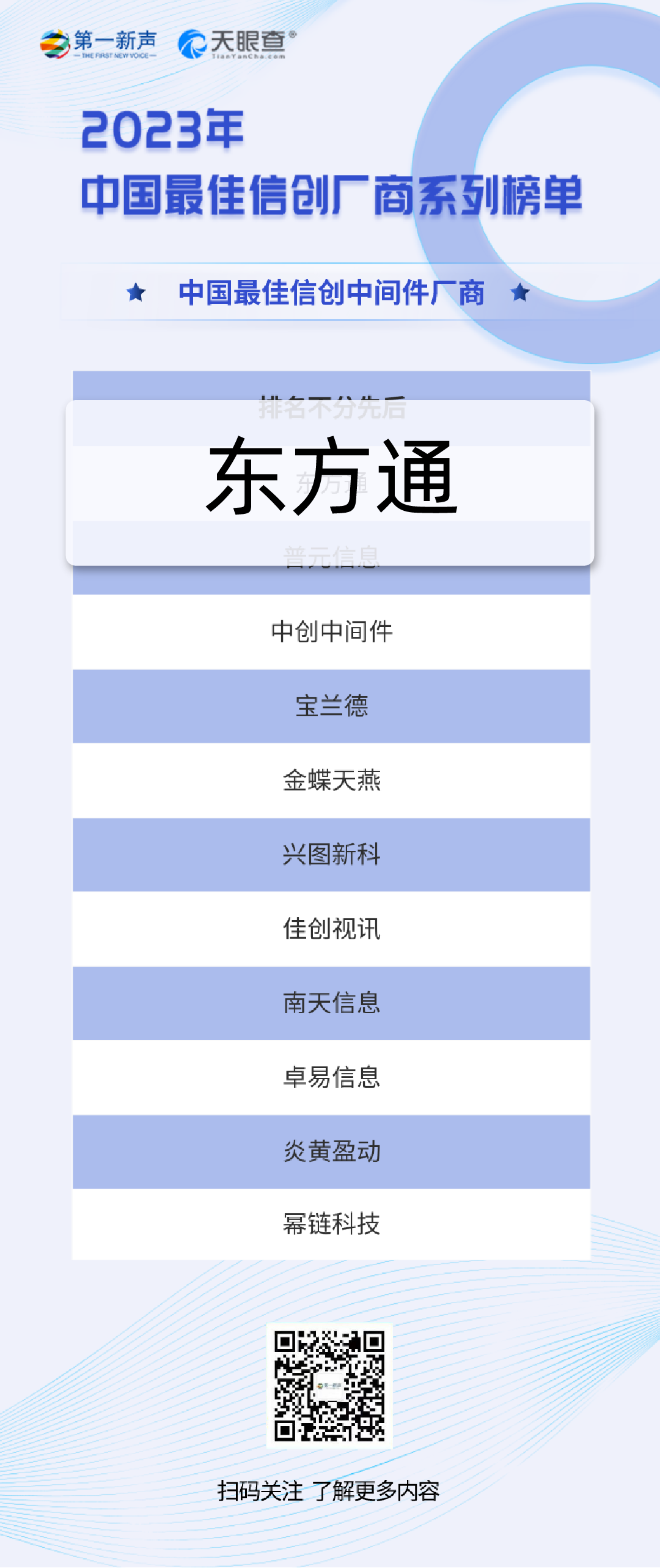 近期,国内科技产业研究平台第一新声发布《2023年中国信创产业研究报告》,发布了2023年中国最佳信创厂商系列榜单,东方通凭借在信创领域技术攻关、产品创新、生态建设、标准制定等方面的深厚积累及突出表现,入选2023年度中国信创-基础软件行业代表厂商、中国最佳信创中间件厂商、中国最佳信创厂商TOP50多项“最佳”认可。
