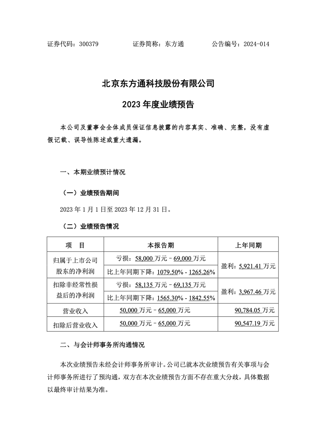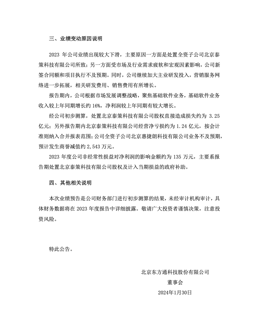 2024年1月30日,北京东方通科技股份有限公司发布《2023年度业绩预告》。