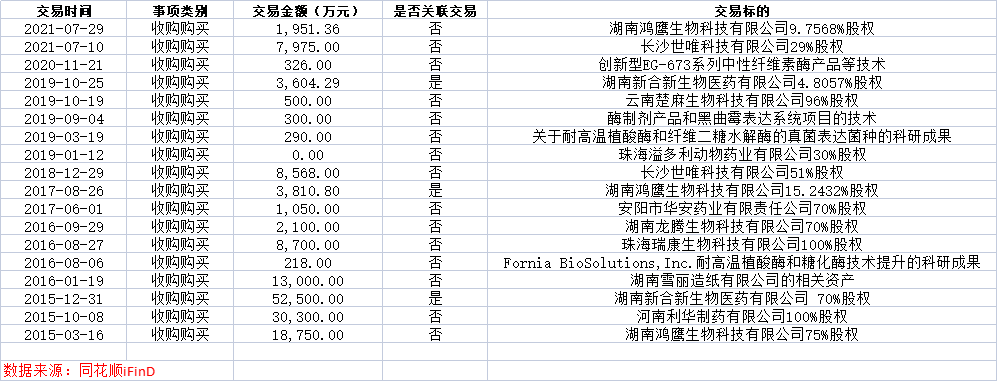 事实上,溢多利上市不久,就在收购方面大显身手。除了鸿鹰生物外,溢多利还收购了利华制药100%股权、新合新生物医药70%股权、湖南龙腾生物70%股权、华安药业70%股权等等。