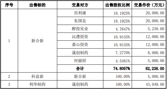 公司拟分别向交易对方昂利康、朱国良、醇投实业、沅澧投资、嘉山投资、晟创制药、何丽招出售持有的全部新合新74.8057%股权;同时,由醇投实业等对新合新进行增资,增资资金用于偿还新合新对公司的债务及利息、购买公司所持科益新的100%股权,以及偿还科益新对公司的债务及利息。交易完成后,公司不再持有新合新股权,新合新对公司债务及利息全部清偿完毕。其中,新合新股权转让、增资、债务清偿行为(以下简称“新合新交易”)互为前提条件。