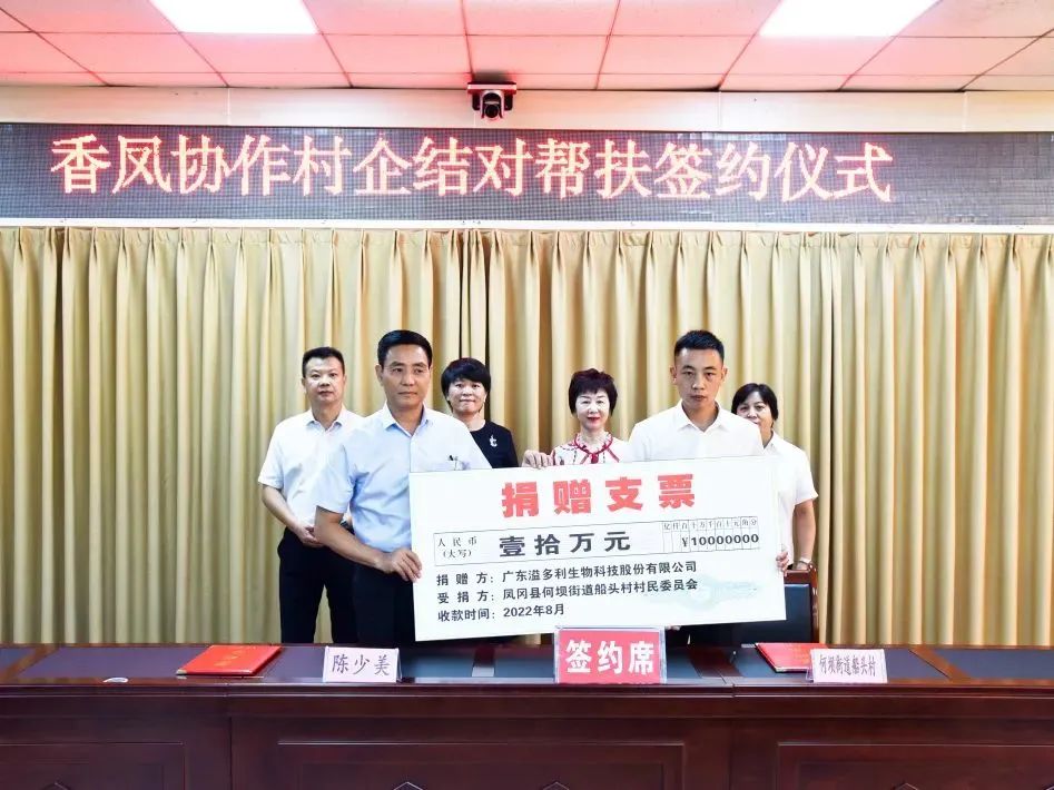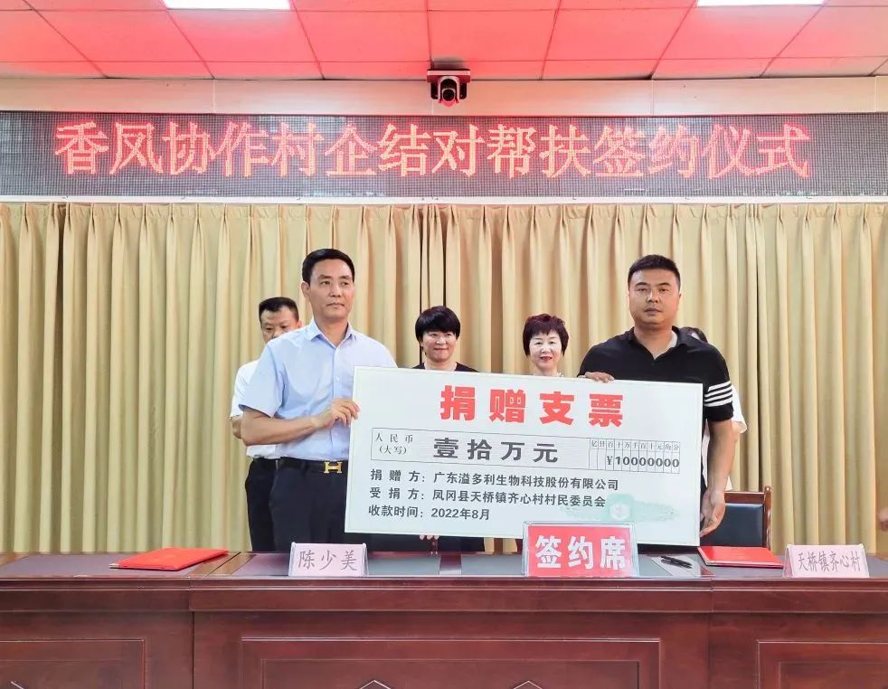 2022年8月,溢多利陈少美董事长向凤冈县天桥镇齐心村、何坝街道船头村捐款