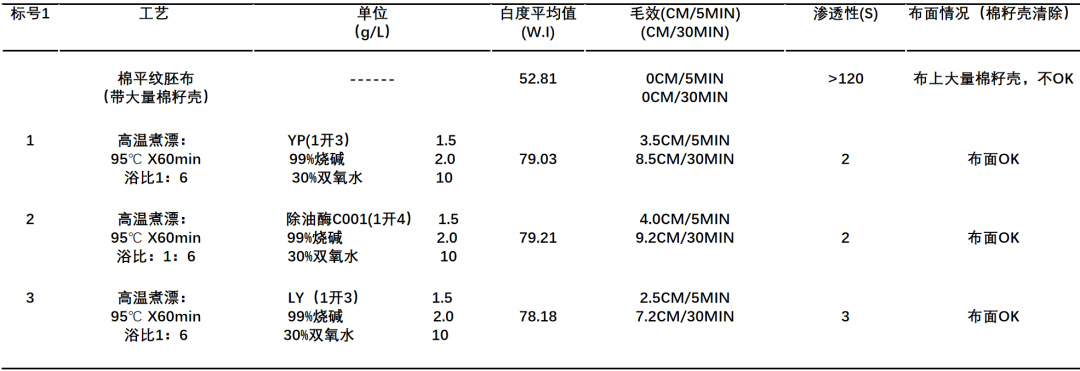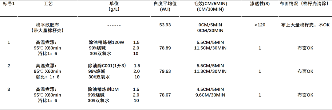 在精炼后的白度测试中,C001的效果明显优于传统化学除油剂,甚至在严苛的煮漂条件下,依旧保持了织物的高白度。试验数据通过图表展示(例如表一、表二),可直观展现C001的优越性能。
