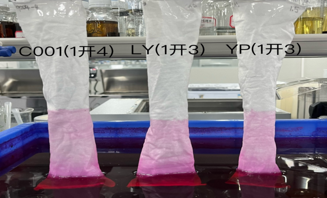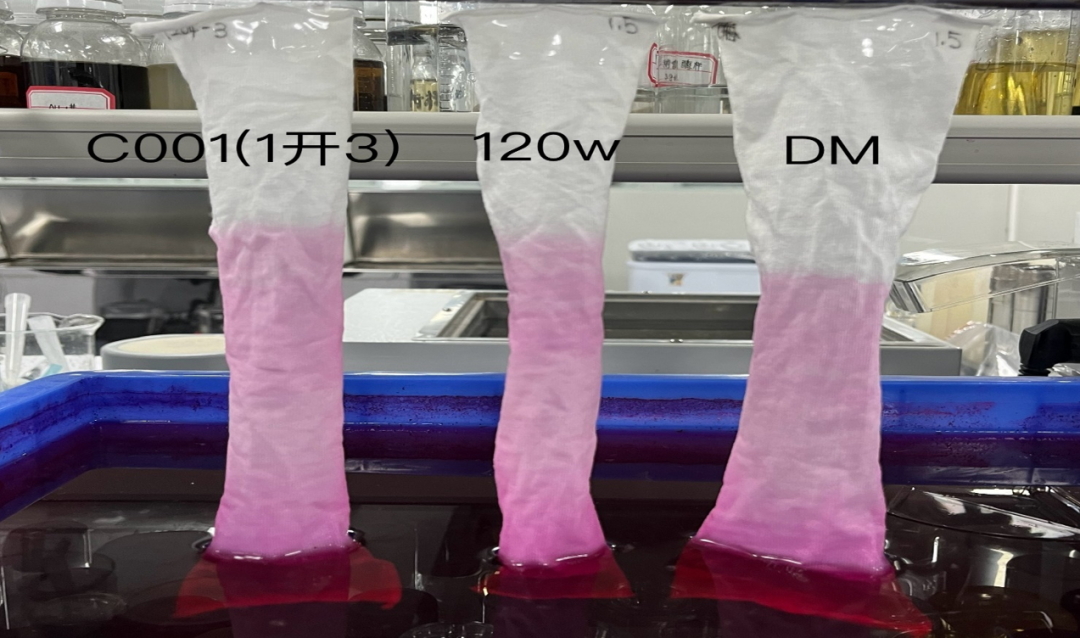 测试显示,使用C001处理后的织物在渗透性和毛效方面具有显著优势。例如在30分钟内,染液爬升高度达到了较高水准(如图一图二、表一表二所示),充分证明了其在提升染色均匀性方面的能力。