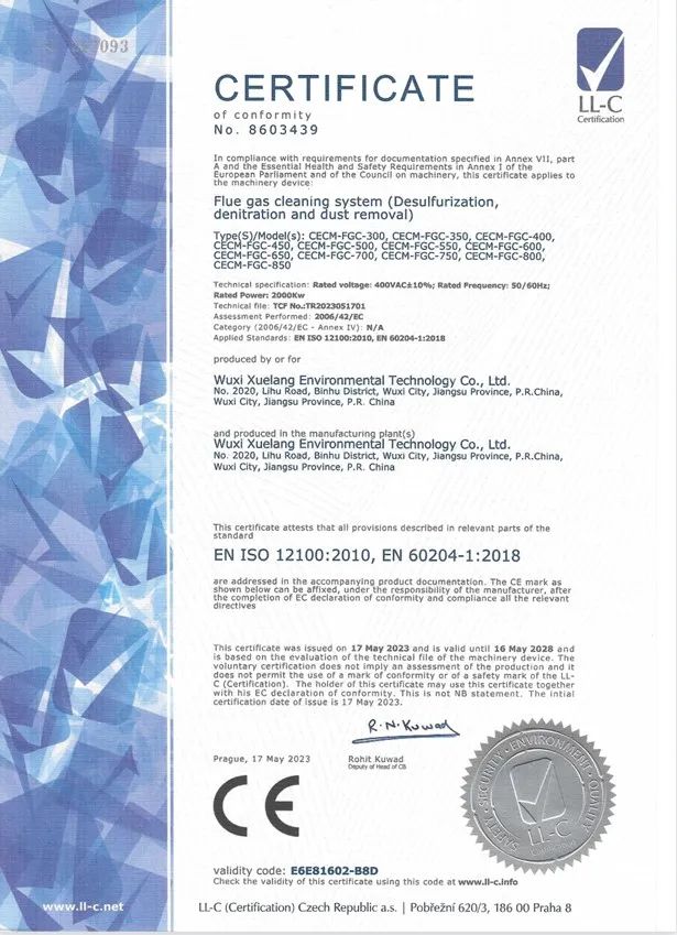 近日,我司烟气净化系统顺利获得欧盟认证机构颁发的CE认证证书,通过了安全指标测定,取得进入欧洲联盟市场的通行证。