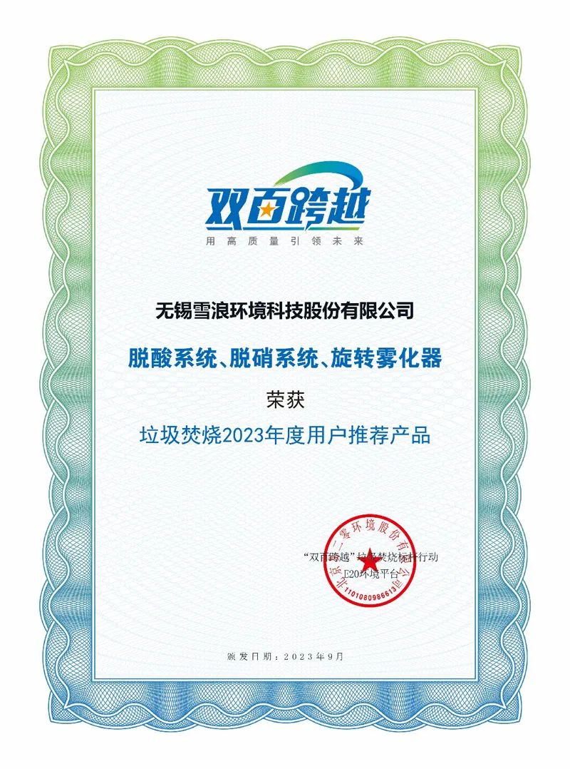 近日,2023(第十届)上海固废热点论坛现场揭晓垃圾焚烧领域关键装备产品“年度用户提名产品品牌”与“年度用户推荐产品”两大产品名录,雪浪环境荣获垃圾焚烧(烟气脱酸系统、烟气脱硝系统及旋转雾化器)2023年度用户推荐产品!