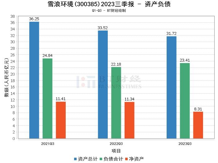 从资产负债方面看,2023年三季度,雪浪环境的总资产为31.72亿元,较上年度末的31.85亿元微降0.43%。负债合计为23.41亿元,与上年度末的23.49亿元相比略有下降。净资产为8.31亿元,较上年度末的8.37亿元微降。资产负债率为73.82%,与上年度末的73.73%相比略有上升。这些数据显示,公司的资产和负债总体保持稳定。