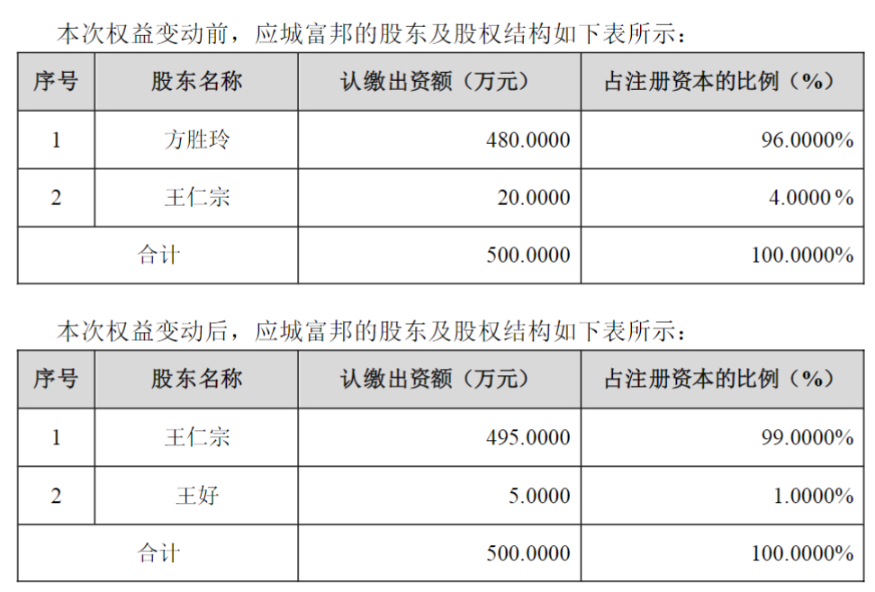 据悉,王仁宗现持有应城富邦99%的股份,为应城富邦实际控制人;方胜玲不再持有应城富邦股份;王好(王仁宗与方胜玲之女)持有应城富邦1%的股份。至此,本轮权益变动全部完成。