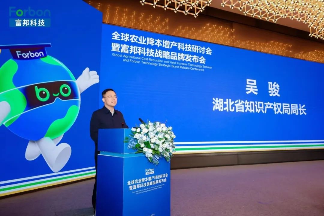 湖北省知识产权局局长吴骏高度评价了富邦科技以核心技术突破和84项商标布局构建企业核心竞争力,其国际专利转让实现技术产业化突破。他强调湖北省将深入实施知识产权强省战略,通过"两行动两工程"强化品牌培育、专利转化和全链条保护,支持农业科技企业以"技术专利群+品牌矩阵"双轮驱动,共同谱写中国式现代化农业新篇章。