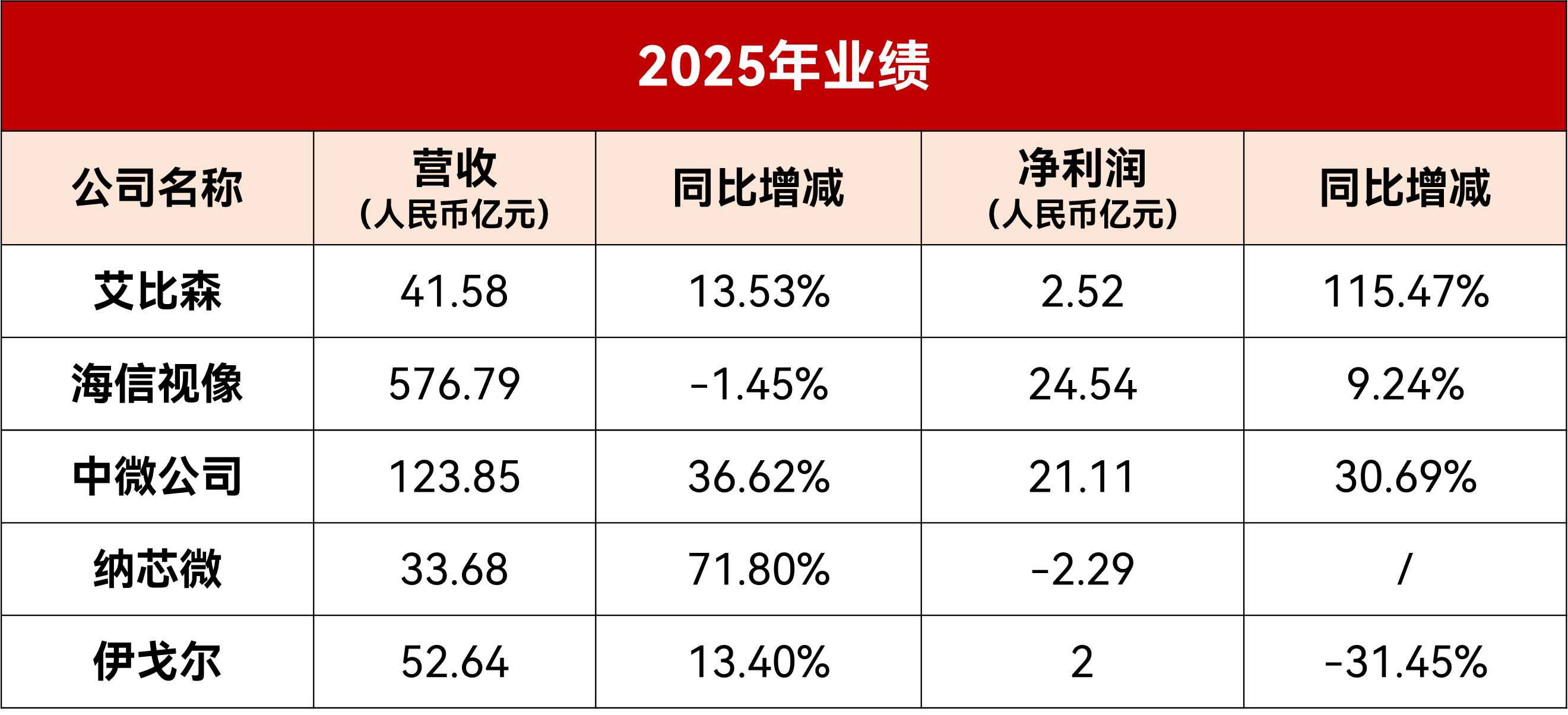 3月30日,艾比森、海信视像、中微公司、纳芯微、伊戈尔相继发布2025年年度报告。其中,艾比森、中微公司实现营收和净利双增,海信视像增利不增收,伊戈尔增收不增利。