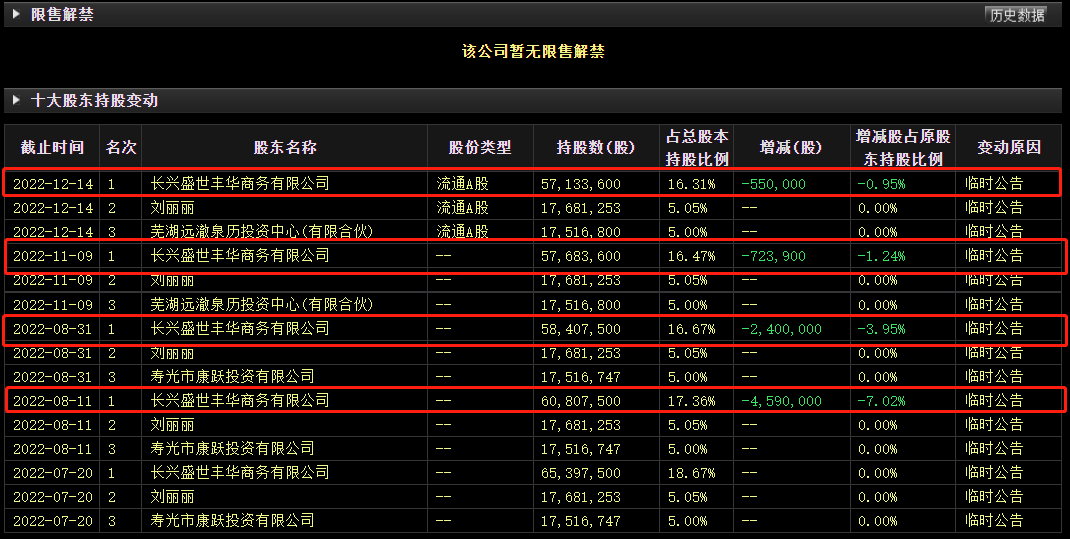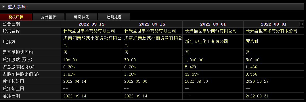 往期看,长兴盛世丰华商务有限公司此前曾多次质押股份。如2022年,其曾陆续向浙江长征化工有限公司、海南润泰欣茂小额贷款有限公司质押。