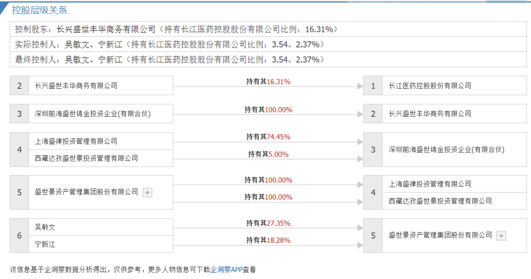而长药控股控股股东为长兴盛世丰华商务有限公司(下称长兴盛世丰华),持有长药控股16.31%股权;实控人为吴敏文、宁新江,两人分别持有长药控股3.54%、2.37%股权。
