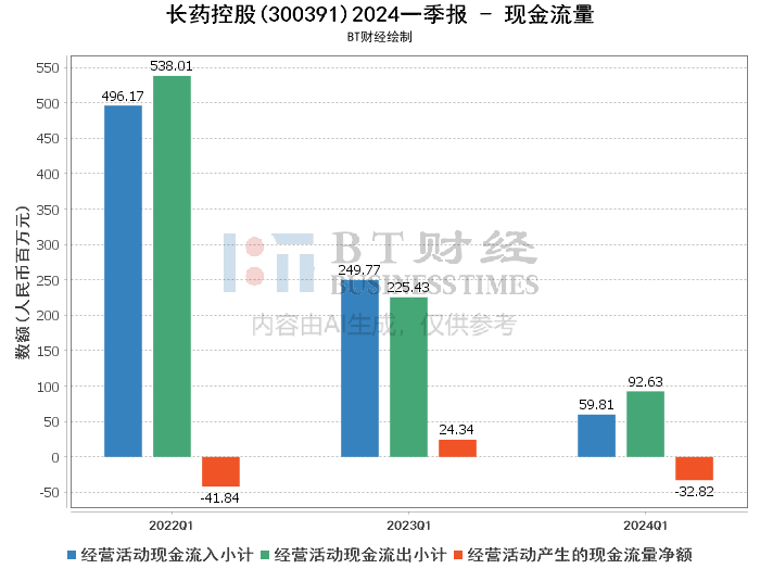 现金流量方面,长药控股的经营活动产生的现金流量净额为-32.82百万元,而上年同期为24.34百万元,同比下降了234.82%。经营活动现金流入小计为59.81百万元,同比减少了76.05%;现金流出小计为92.63百万元,同比减少了58.91%。筹资活动现金流入小计为59.69百万元,同比大幅增加1347.23%,主要由于借款增加。筹资活动产生的现金流量净额为31.5百万元,而上年同期为-32.24百万元,增幅为197.70%。现金及现金等价物净增加额为-3.98百万元,同比减少了53.00%。