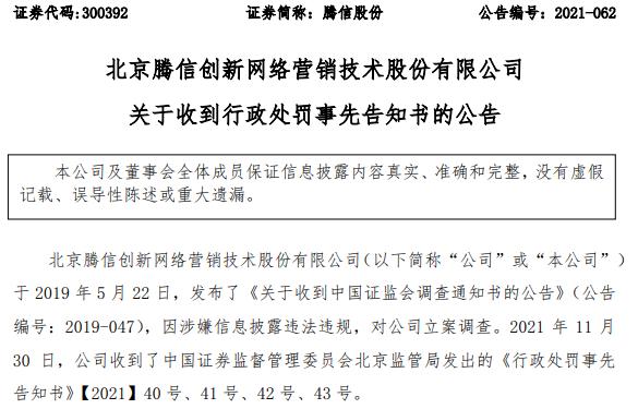 北京腾信创新网络营销技术股份有限公司(腾信股份,300392)在2021年12月1日发布了《关于收到行政处罚事先告知书的公告》。公告内容显示,腾信股份(300392)涉嫌信息披露违法违规案已由我局调查完毕,我局依法对你作出行政处罚。根据当事人违法行为的事实、性质、情节与社会危害程度,证监局拟决定对腾信股份给予警告,并处以200万元罚款,对徐炜罚款300万元,史实罚款30万元,徐卓慧罚款10万元。
