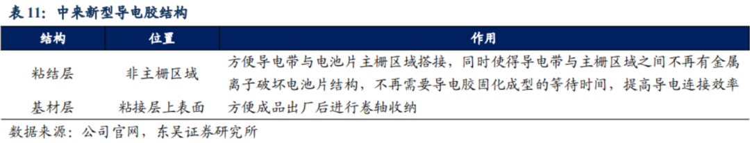 低温固化导电胶技术解决焊接痛点,0BB 落地指日可待。在 0BB 技术突破方面,公司也获得了可喜进展。目前公司已取得了一种新型低温固化导电胶合层的专利,实现了在较低温度范围就能够将焊带与电池接触点部分进行有效粘连,从而降低了电池片弯曲、隐裂和破碎的可能性,很好地解决了 0BB 电池片的焊接痛点,有利于通过无主栅技术实现进一步的提效降本。