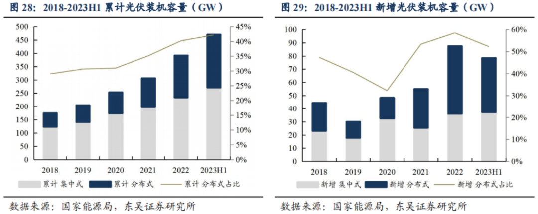 分布式光伏装机占比持续提升,发展空间未来可期。在“碳中和”、“碳达峰”的大背景下,我国政府制定大量鼓励性政策和指导性政策推动分布式光伏良性发展。此外,光伏技术进步、需求增长同样推动分布式光伏装机容量持续提升。根据国家统计局的数据,2021 年,我国新增分布式光伏装机占新增总装机的 53.4%,新增量首次超过集中式光伏电站;2022 年,这一占比更是提升至 58.5%;累计分布式光伏装机占比也从2018年的 29.01%提升至 2023H1 的 42.18%,分布式光伏装机发展势头旺盛、增长空间未来可期。