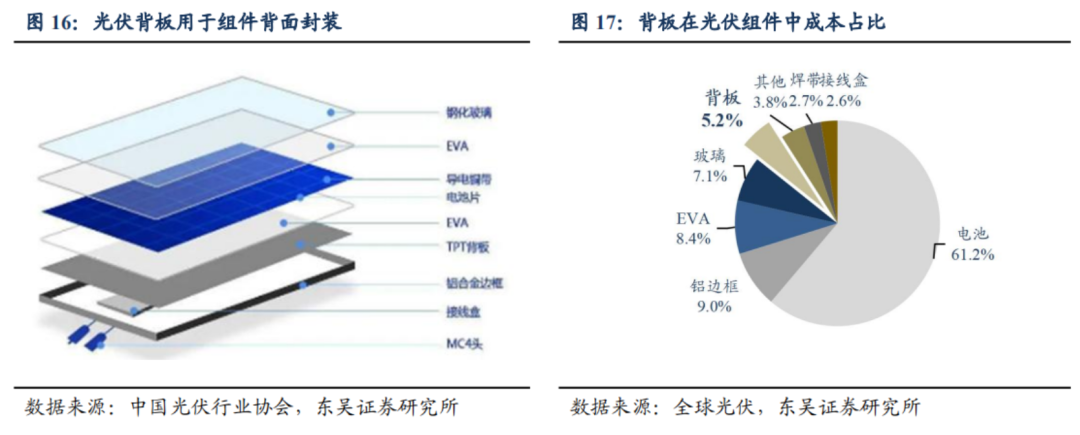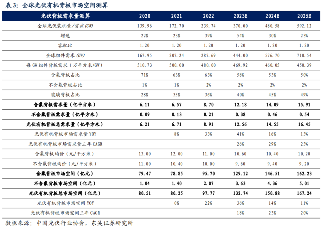 新增产能加速落地,背板需求将保持稳步增长。随着产业链价格下降,终端装机需求旺盛,引致背板需求提升。根据中国光伏协会的数据,我们预计含氟背板市场占比从2020 年 71%下降至 2025 年 50%。我们测算,光伏有机背板需求量将从 2022 年 8.91 亿平方米增长至 2025 年 16.45 亿平方米,三年 CAGR 为 23%;光伏有机背板市场空间将从 2022 年 97.77 亿元增长至 2025 年 167.24 亿元,三年 CAGR 为 20%。
