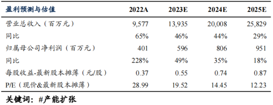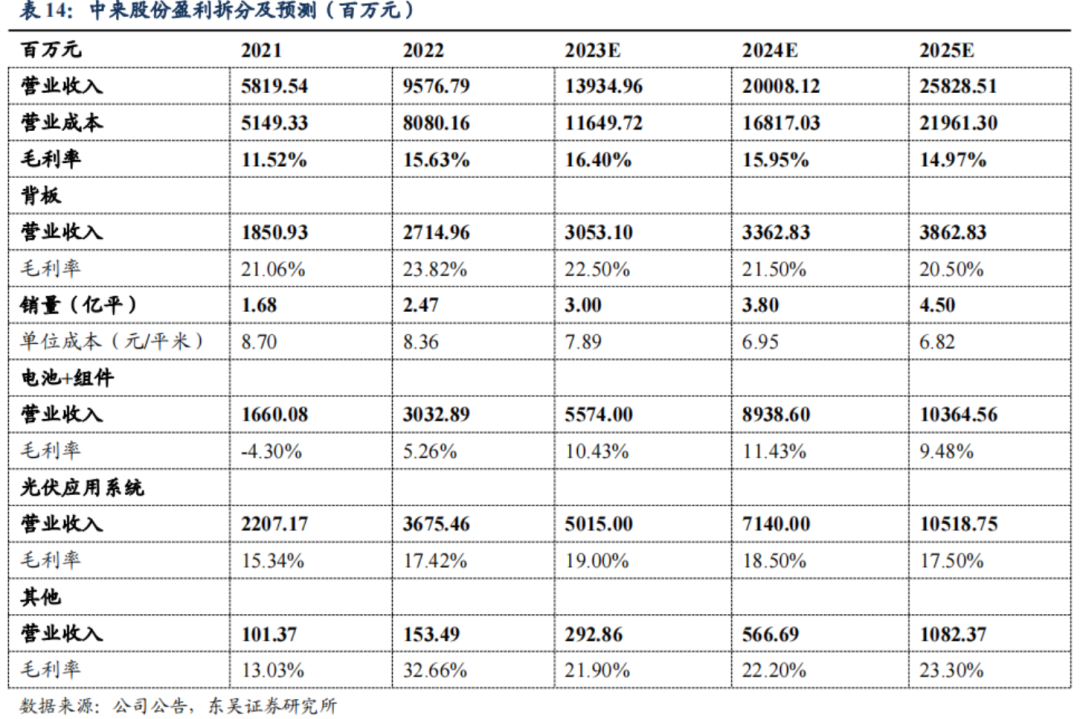 考虑公司光伏背板的领先地位、TOPCon 电池组件和光伏应用系统的发展优势,有望充分受益于 N 型迭代下全球光伏装机需求的高速发展。我们预计 2023-2025 年公司营业总收入分别为 139.35/200.08/258.29 亿元,其中背板业务 2023-2025 年销量预期分别为3.00/3.80/4.50 亿平,贡献收入 30.53/33.63/38.63 亿元,毛利率分别为22.50%/21.50%/20.50%;电池组件业务 2023-2025 年预期贡献收入 55.74/89.39/103.65 亿元,毛利率分别为 10.43%/11.43%/9.48%;光伏应用系统业务 2023-2025 年贡献收入50.15/71.40/105.19 亿元,毛利率分别为 19.00%/18.50%/17.50%。