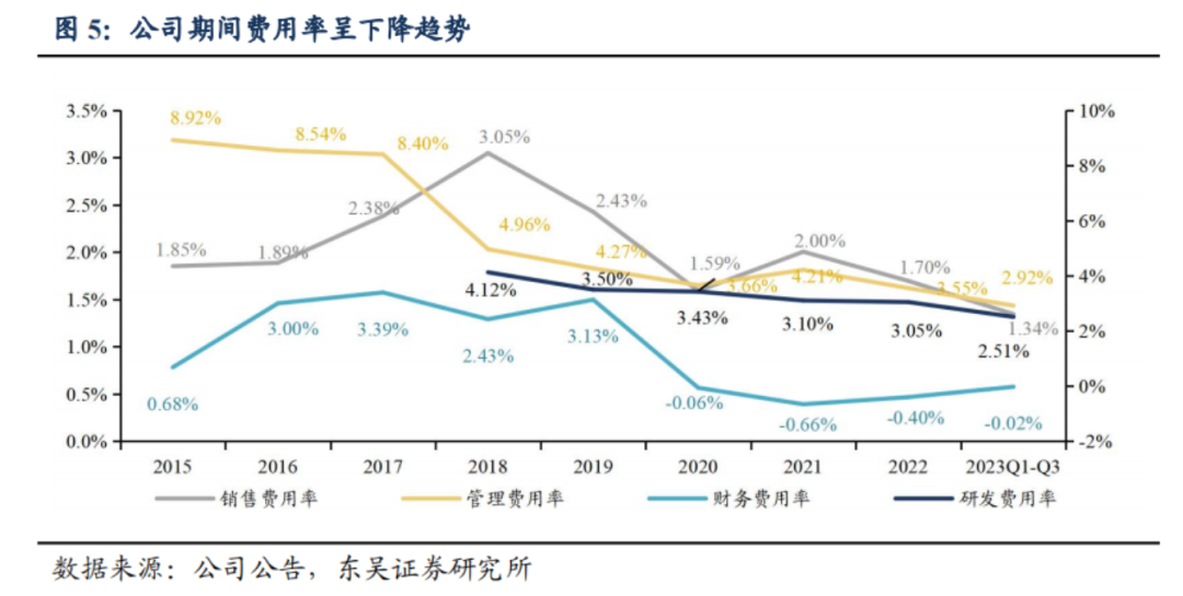 公司费用控制能力优秀,期间费用率呈现下降趋势。自 2019 年以来,公司的销售费用率、管理费用率、财务费用率、研发费用率都有不同程度的下降,优秀的费用控制能力有利于公司拓展更大的盈利空间。