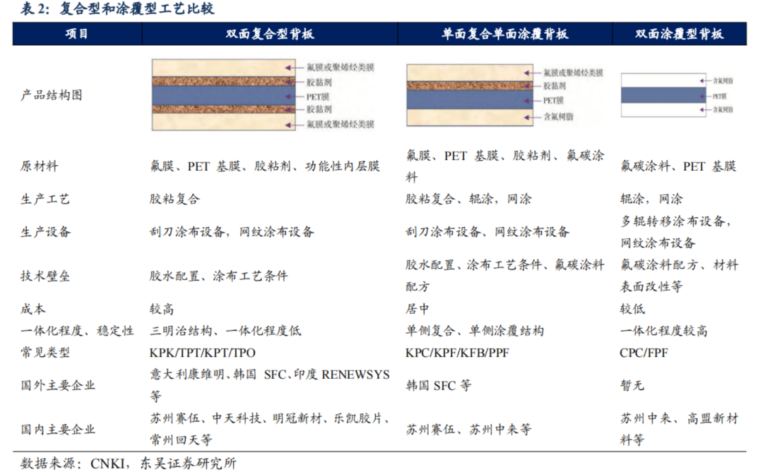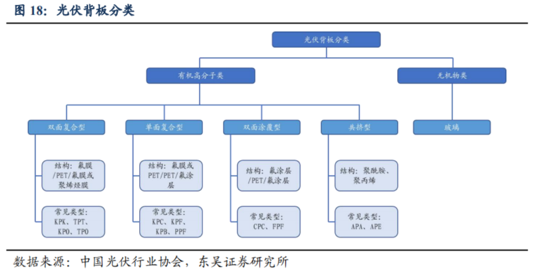背板按其所用材料可分为无机背板(玻璃背板)和有机高分子背板。前者多用于双玻组件,后者可按含氟情况继续细分为双面氟膜背板、单面氟膜背板和不含氟背板,价格和耐候性随氟含量减少依次降低;也可按生产工艺再分为复合型背板、涂覆型背板、共挤型背板,其中,氟膜通过胶黏剂复合在 PET 基膜上即为复合型背板,一般具有氟膜/PET/氟膜三层结构,目前 PVDF 为主流氟膜;将含氟涂料直接涂覆在 PET 基膜上则为涂覆型背板。