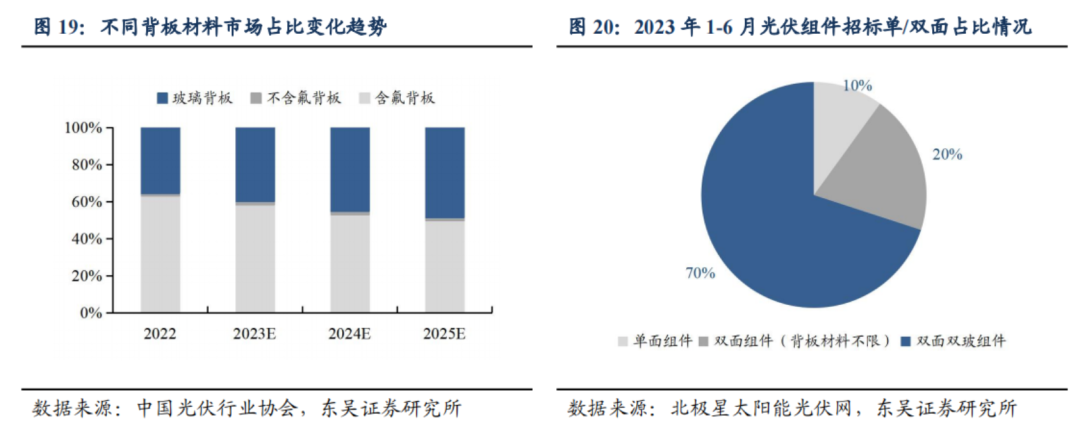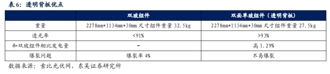双面组件市场中,玻璃背板仍为主流选择,透明有机背板有望进一步放量。根据北极星太阳能光伏网,2023 年 1-6 月组件招标中,双面组件共占 90%,其中双面双玻组件占 70%,不限背板材料的双面组件仅占 20%,玻璃背板仍为双面组件主流选择。未来,随着组件双面发电需求增加,玻璃背板市占率预计进一步提升,而透明有机背板因具备轻量化、爆裂风险低等优势,有望乘势而上。