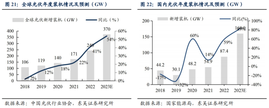 “双碳”背景下全球光伏装机持续增长,国内光伏装机项目加速推进。“双碳”目标背景下全球正处于能源结构转型的重要阶段,各国对可再生能源的重视度大幅提升,光伏市场由此迎来蓬勃发展,2022 年全球新增光伏装机 240GW,同比增长 41%。国内,随年初硅料降价、库存放量,部分受抑制的地面电站需求将在今年释放,叠加分布式持续增长,我们预测 2023 年国内新增装机达 160GW,同比增长 83%左右。