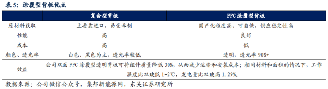 公司研发涂覆型背板,打破进口垄断,大幅降低背板价格,并且相比传统复合型背板具备显著优势。在早前对高分子材料的研发经验基础上,中来通过自主研发,采用有机无机纳米杂化技术、分子设计互联贯穿技术,成功研制出以四氟型树脂为主体的FEVE 氟碳涂料,再进行加工,最终开发出了涂覆型背板产品——单面涂覆 TFB/KFB产品、双面涂覆 FFC 产品,成为业内最先实现涂覆型光伏背板产业化生产企业之一。涂覆型背板产品不需要使用氟膜、胶粘剂,冲破了欧美日等企业的技术垄断。此外,公司主打的双面 FFC 涂覆型高透明网格背板相较于传统复合型背板有显著优势:在保障组件可良好工作 25 年的基础上,有更高的原材料获取的保障性、更低的运输和安装成本、更高的工作效益等。